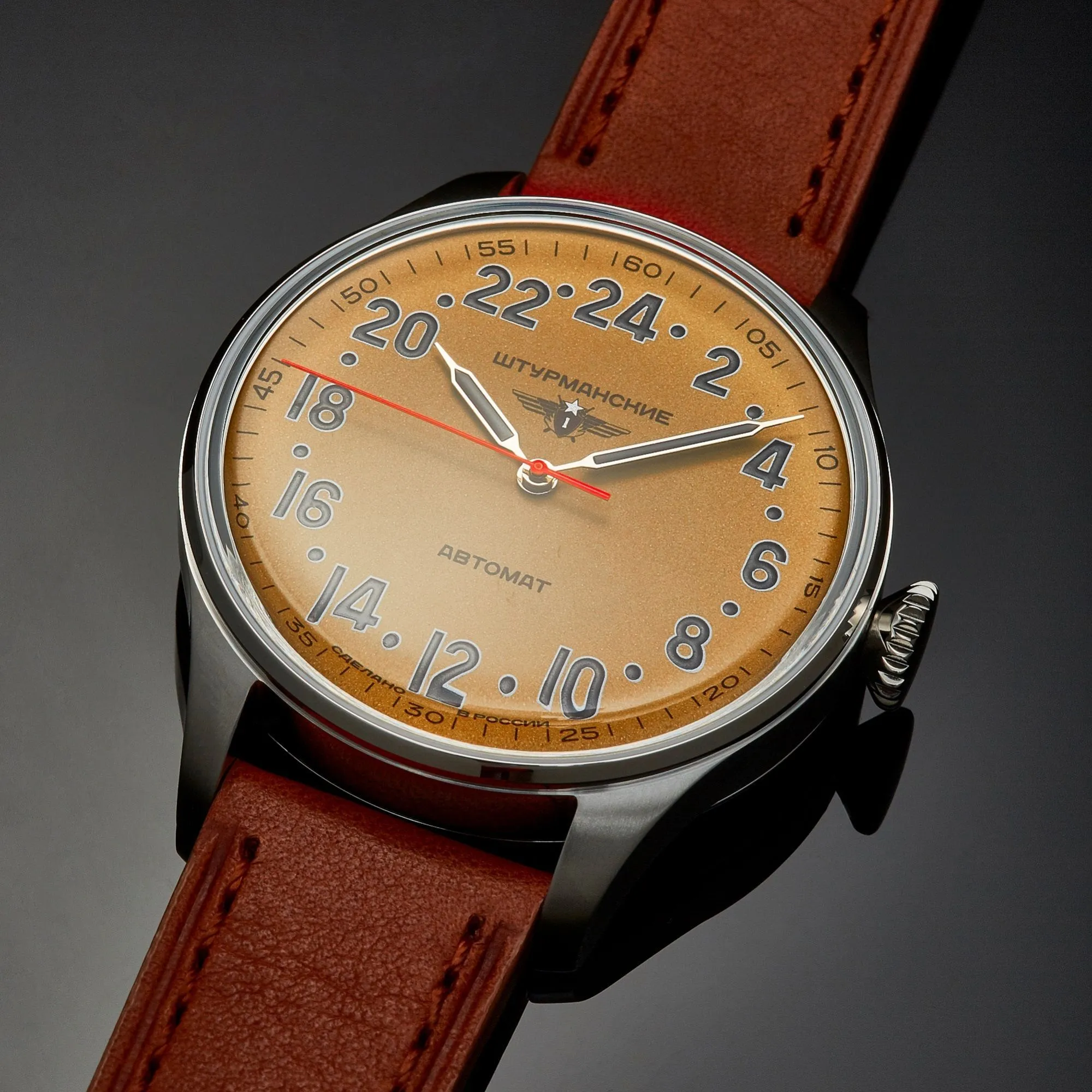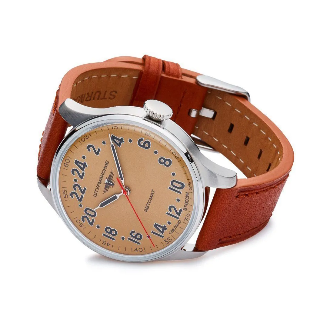 For more than 60 years, watches from the Arctic Heritage collection have been constant companions of Russian polar explorers and travellers. Their reliability has been confirmed by the most severe trials and in the most challenging conditions. Today, we have made a reissue of this legendary product range available to you. This watch is a new interpretation of the classics. Its design is based on a light retro concept. A medium-sized beige dial with a 24-hour bezel and a minimalist orange-brown leather strap are in harmony with the simple steel case. The Vostok 2431 automatic movement provides a power reserve of up to 31 hours. The daily deviation is small for a watch of this type, no more than -20/+60 seconds per day. The watch face is covered with light acrylic crystal, and the luminous numbers are perfectly readable in any light.Technical data