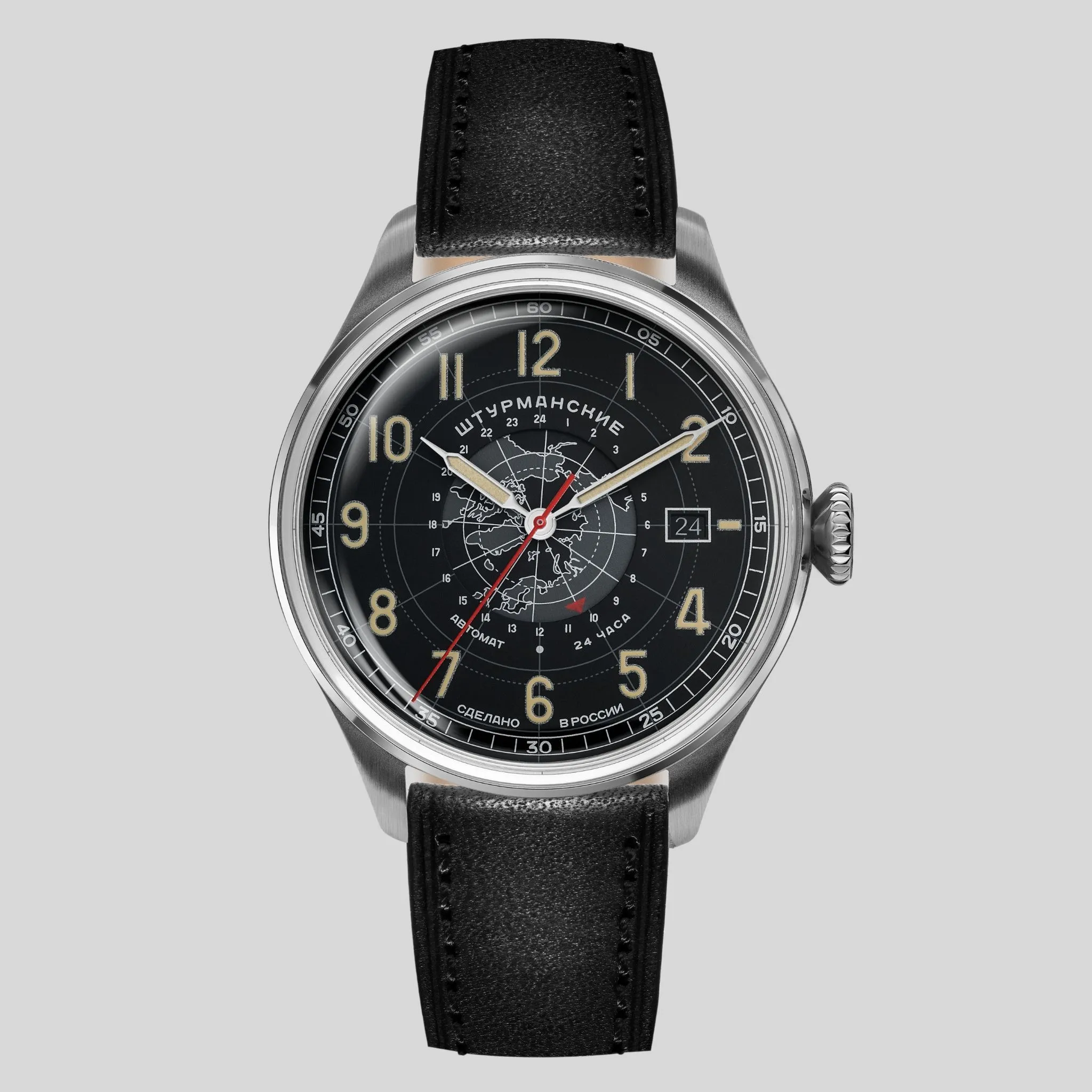 The Arctic Day-Night watch will never fail anywhere. It is no coincidence that these timepieces are chosen by polar explorers and travellers for the most challenging expeditions. The luminous numbers are perfectly visible even in the dark, and the two-time scales help quickly switch between two time zones. Comfortable to wear, this is a beautiful watch with a wide range of options. It displays the time as well as the current date. The leather strap fits securely and comfortably on the wrist. The black and steel timepiece looks striking thanks to a stylish accent – the red seconds hand. The stainless-steel case hides a time-tested Vostok 2432 mechanical calibre with automatic winding and a 33-hour power reserve. It is highly accurate and shockproof. The dial is covered with an acrylic crystal, durable but lightweight.Technical data