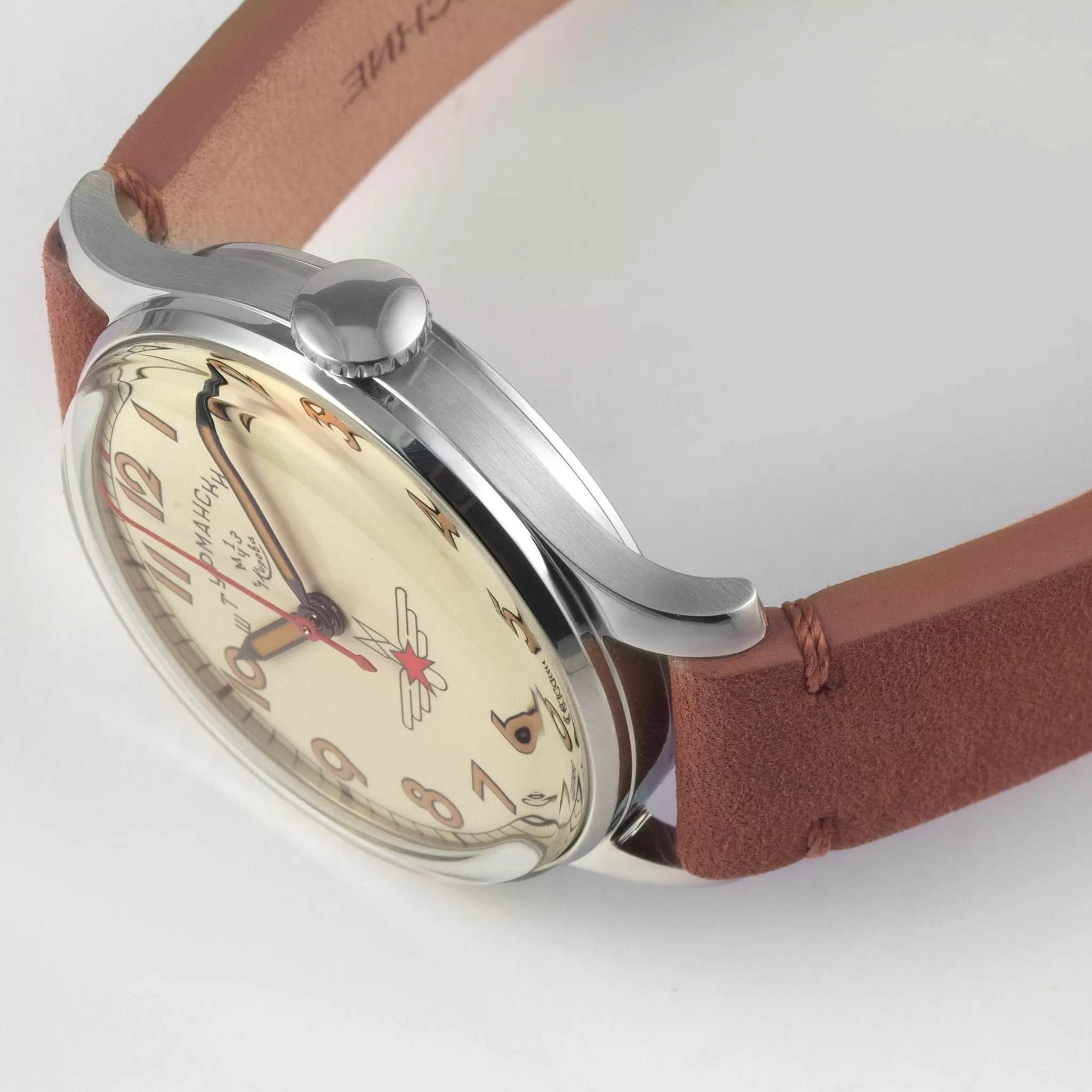 12 April 1961 marked the start of a new age for humanity. Inspired by the courage and daring of the first space traveller, we have developed the Gagarin First series, trying to make every piece in it perfect in every respect. A stylish timepiece with a minimalist but original design. The small ivory watch face is easy to read thanks to the large nimbers. Telling the time will be easy even in the dark as the numbers and hands are luminous. The leather strap is not stitched, but it looks attractive due to the bright orange colour and attachment to the case lugs with large stitches. The unique number of the watch is engraved on the back of the stainless steel case, covered with a transparent screw-down lid. The dial is protected by a convex mineral crystal. The watch is powered by a Russian-made hand-wound Poljot 2609 movement.Technical data