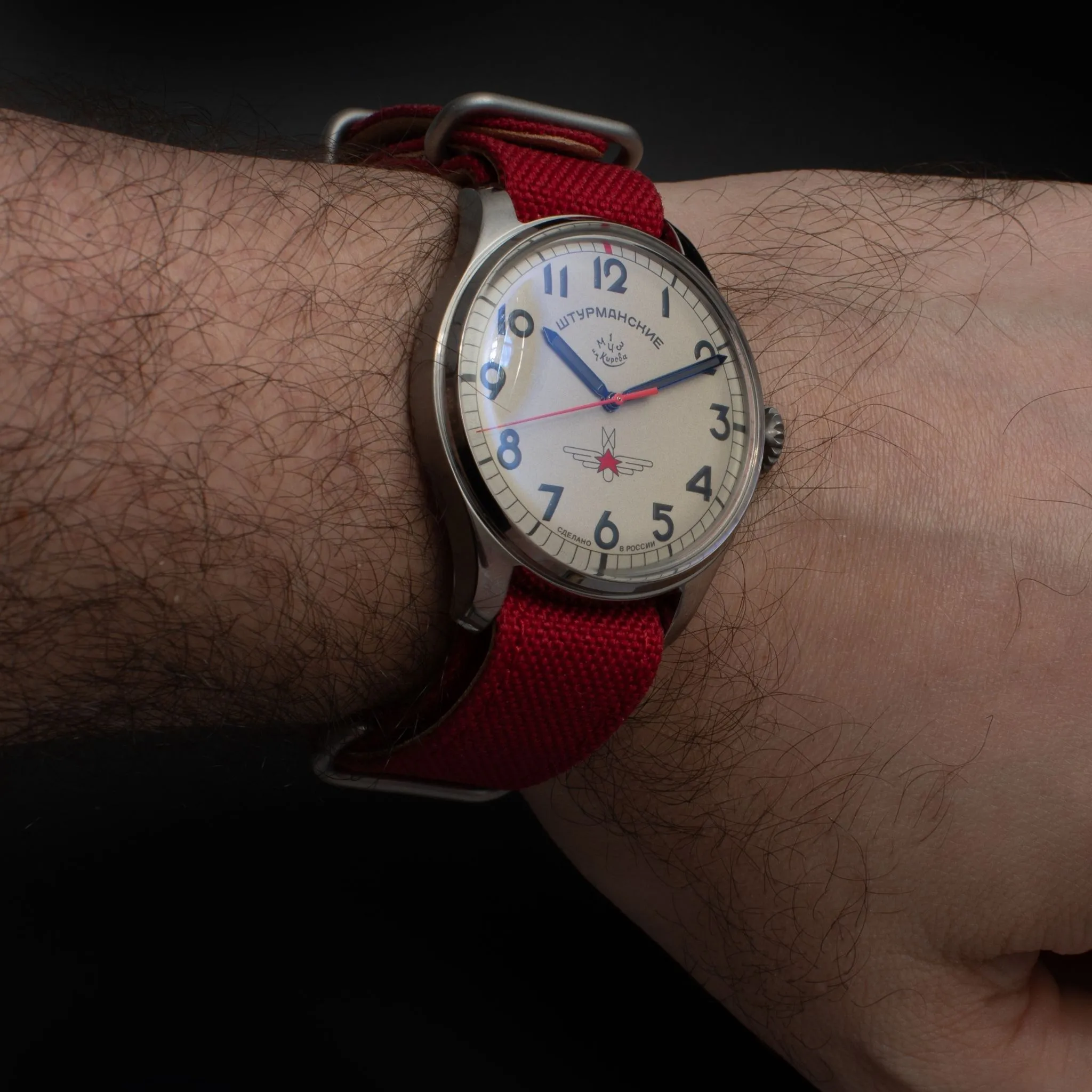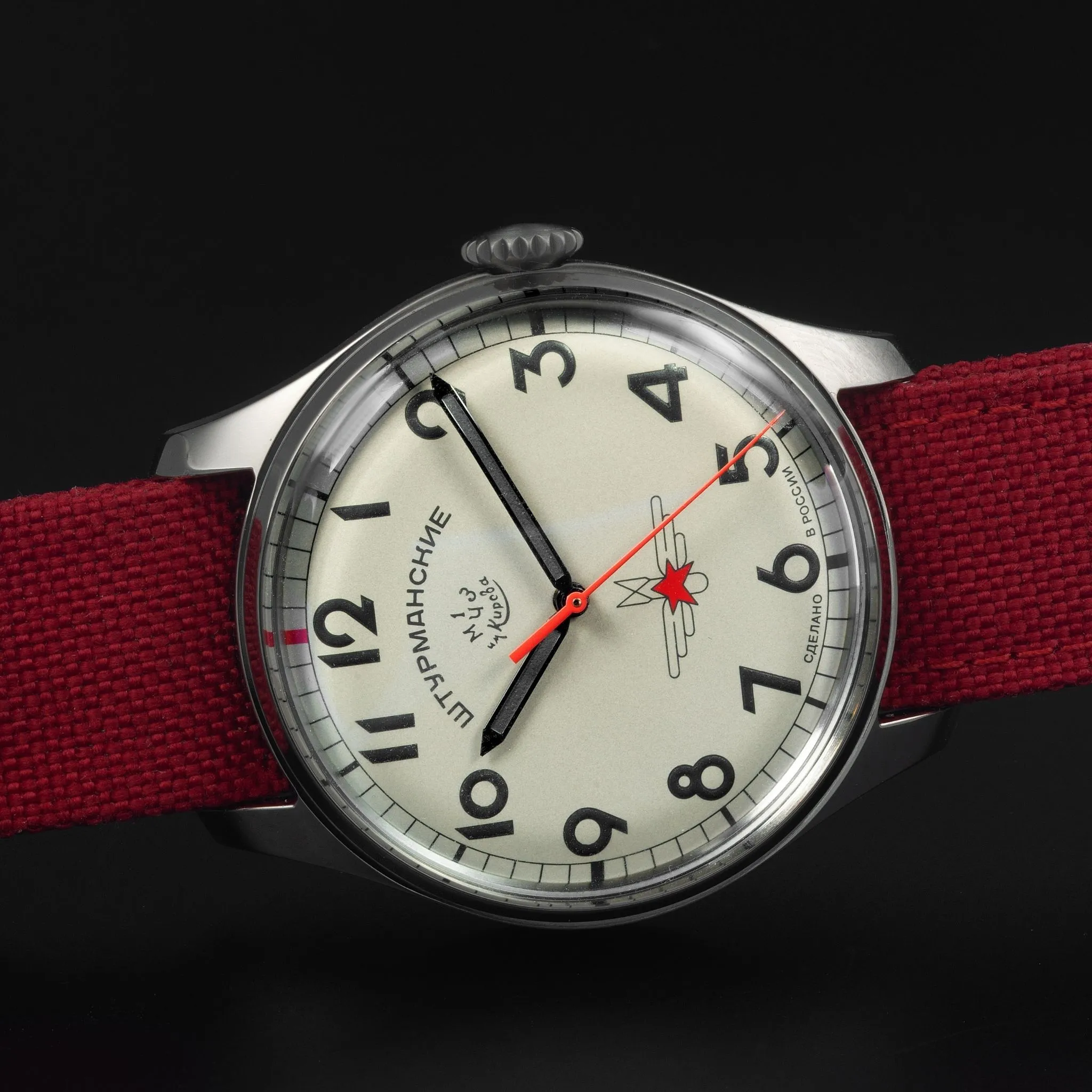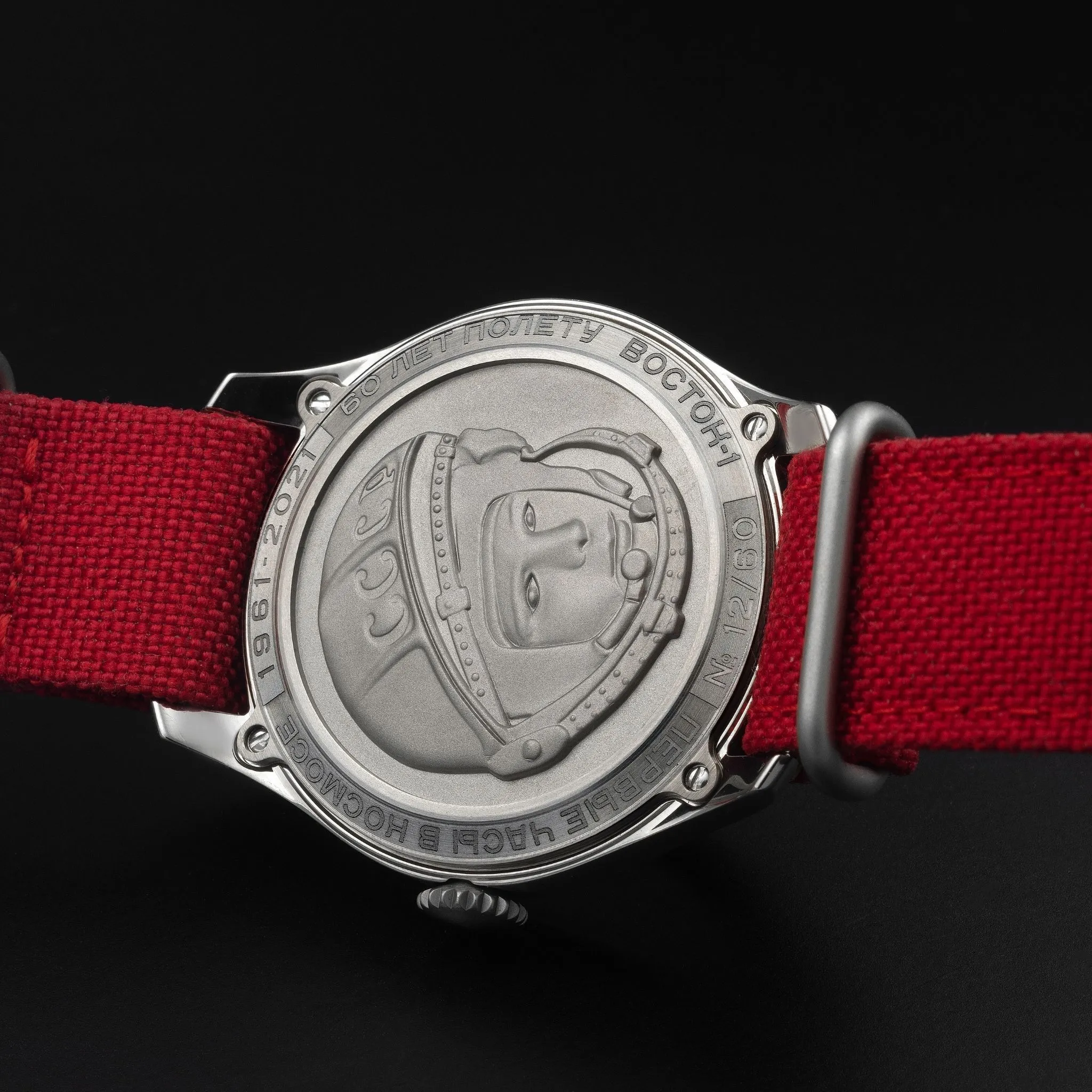 On 12 April 1961, a Sturmanskie watch accompanied Yuri Gagarin on the first manned flight into space. To commemorate that momentous event, we now present the limited edition anniversary Gagarin 60 collection – a range of watches worthy of the great hero. This model has a striking design. The red textile strap looks exquisite next to the steel case and the understated white watch face under a spherical mineral crystal. The back cover is decorated with a bas-relief with the image of Yuri Gagarin with a unique anniversary engraving "60 years of the flight of Vostok-1" and a serial number of the edition. It is a limited edition of 60 pieces worldwide. The watch is equipped with the original Polet 2609 automatic winding movement and a power reserve of 38 hours.Technical data