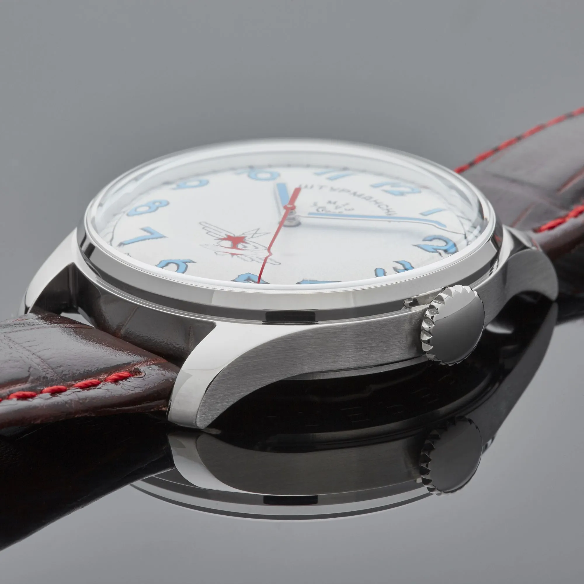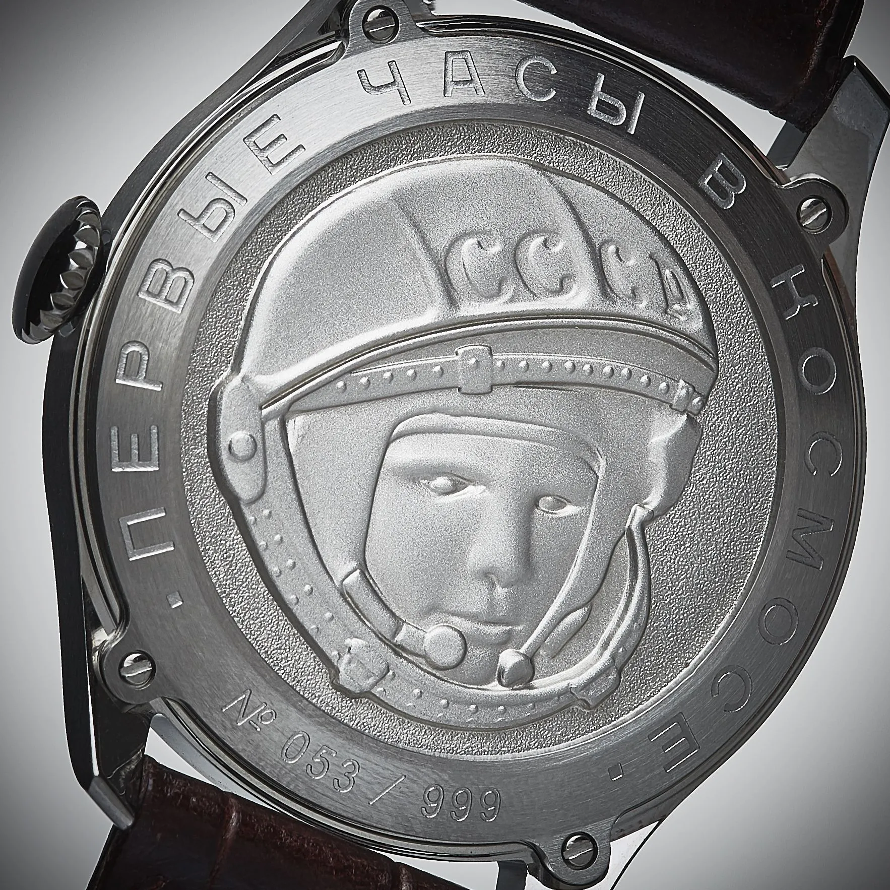 The thin bezel reveals the dial face, also sphere- shaped, as if retracing the glass. The clear and legible minute scale extends beyond the visible area of the dial, emphasising the elegance of the bezel. The digit scale on the dial is a distinctive feature of this model; its design has not changed since the very first Gagarin series. The austere, long, curved hands complete the design of the watch and the collection while keeping the piece very functional. The conical crown with convenient notches replicates the original model design. The 2022 limited edition 999 pieces is made of 904L steel;each case is individually numbered and stamped STEEL 904 on the back of a lug.