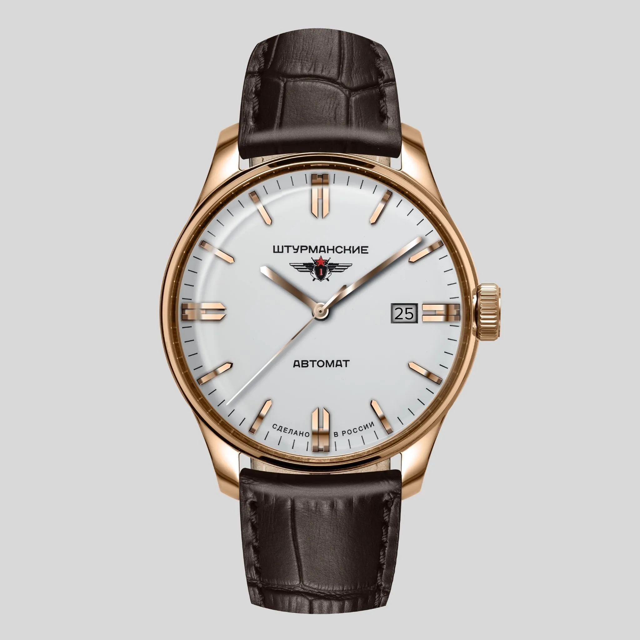 A simple thing becomes extraordinary in the hands of a genius. After Yuri Gagarin’s legendary flight, his simple Sturmanskie watch became the dream of millions. Today we bring it to life with the Gagarin Classic Automatic collection. This watch looks especially stylish and sophisticated due to its minimalist but well thought-out design and unusual colour palette. The steel case is plated with a thin layer of rose gold. The high pressure vacuum coating technique, PVD, improves its strength and wear-resistance. The white watch face is adorned with luminous oblong indices and thin silvery hands. The date is displayed in a separate window. The watch is powered by a premium Japanese mechanical Miyota 9015 calibre. It is self-winding, has a long power reserve (42 hours) and high precision.Technical data