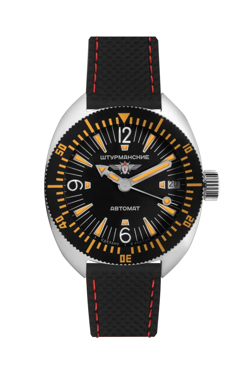 Humans view the sea as eternal and immeasurable, but once we find ourselves in that element, it always tests us for strength. And that is when we need the extra accuracy and reliability, so we create devices that help us locate ourselves in time and space in this infinity. It has always been so. "Amphibia" watch is powered by a Russian mechanical movement with automatic winding, 2416 Vostok. Case is made of surgical grade stainless steel. Waterproof to up to 200 meters (20 ATM) and secured by a thick spherical glass, screw-in cap and cover. Black rotating bezel - a classic solution for diving watches - is featured by contrast blue luminescent indices and clear geometric lines. On the back cover - a tribute to the heritage model - relief image of a rider on a dolphin - the Amphibian Man.Technical data
