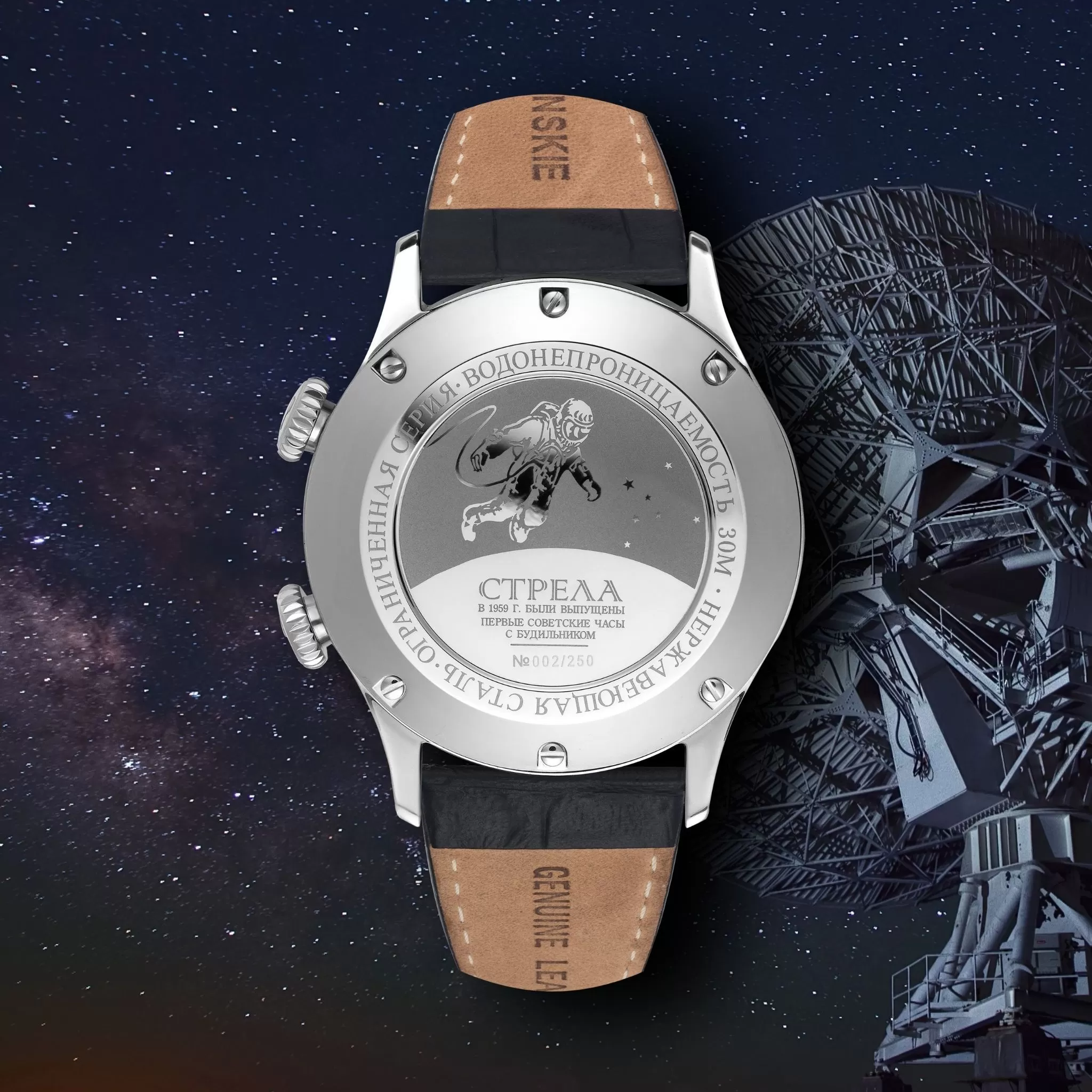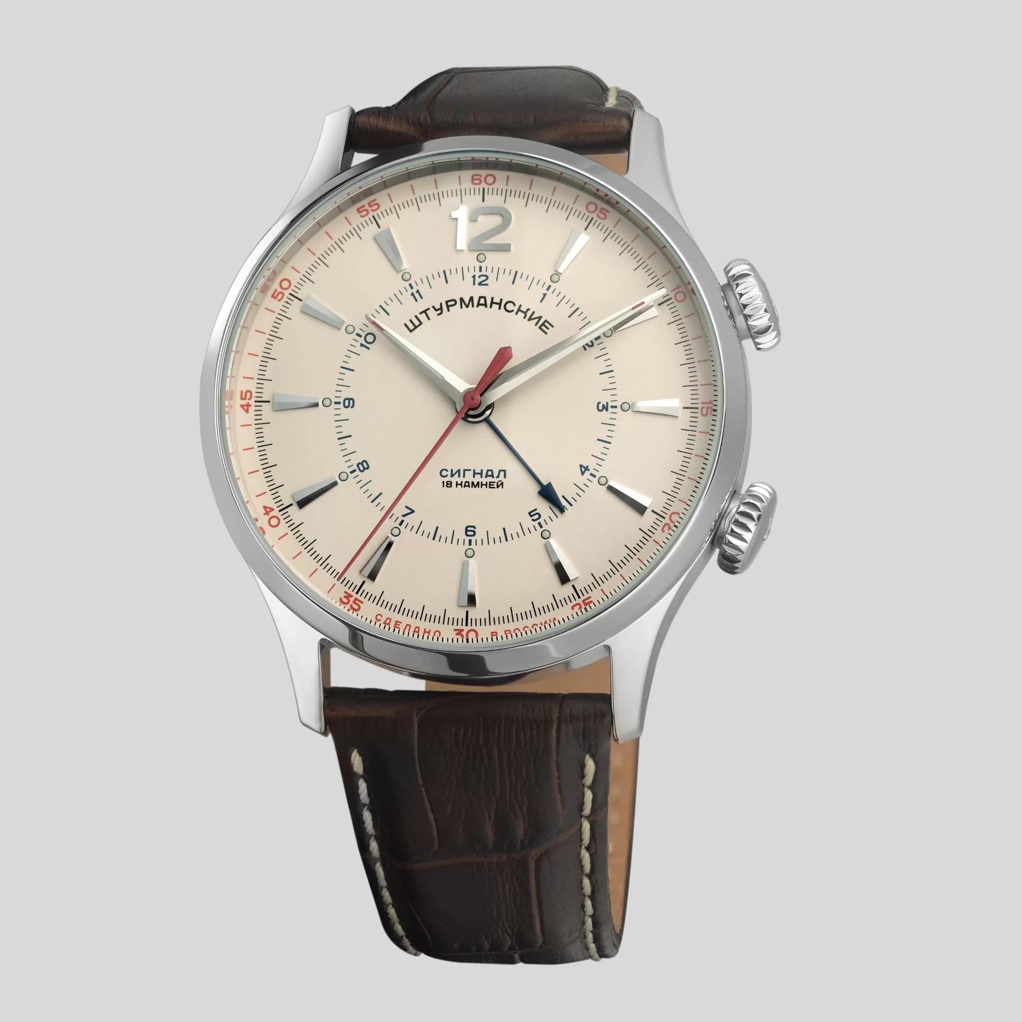 Open Space Signal is a range of Sturmanskie watches created on the basis of the unique Soviet Poljot 2612 calibre with a signal function. This limited edition timepiece is considered a collector’s item. Do not deny yourself the pleasure of becoming the owner of a legend. This watch is a true embodiment of the Soviet classics. Its minimalist design is emphasised by its understated colour scheme: the white watch face is ideally matched with the dark brown leather strap and the polished steel case. The indices and hands on the large dial are luminous, perfectly legible even in complete darkness. The movement has a power reserve of 31 hours.Technical data