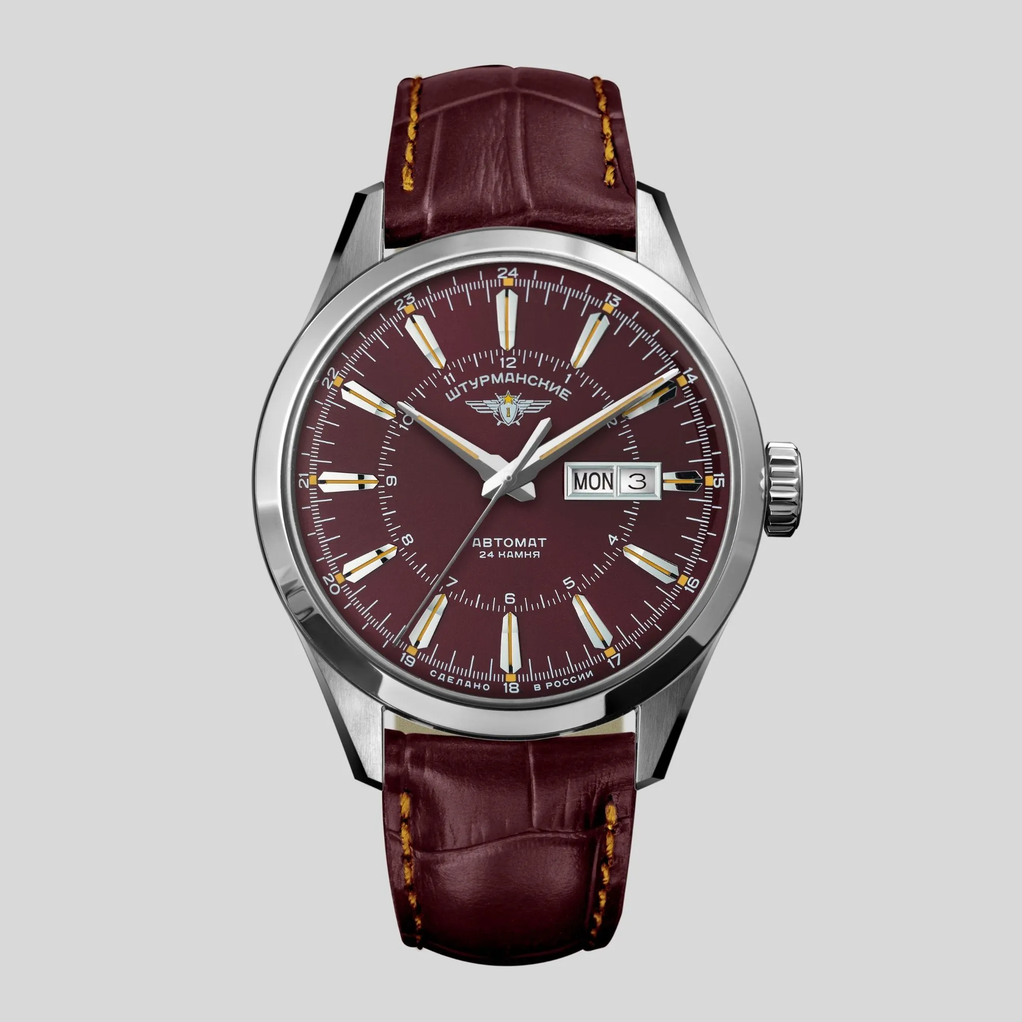 The Open Space Day-Date Automatic line is a new interpretation of the classical watch. The collection is distinguished by a modern design with complex lines and shapes, a functional dial showing the time, the date and day of the week, and a reliable mechanical Seiko NH36 calibre with automatic winding. The bright burgundy of the dial makes this model distinctive, and the silvery baton indices and thin elegant hands look perfect on it. It is covered with a spherical mineral crystal. The brown padded leather strap fits perfectly on your wrist. A reliable Japanese-made movement with a power reserve to last 41 hours is concealed inside the steel case with a ribbed winding crown to spur it on. The back cover features an engraved image of an astronaut based on a painting by Alexei Leonov.Technical data