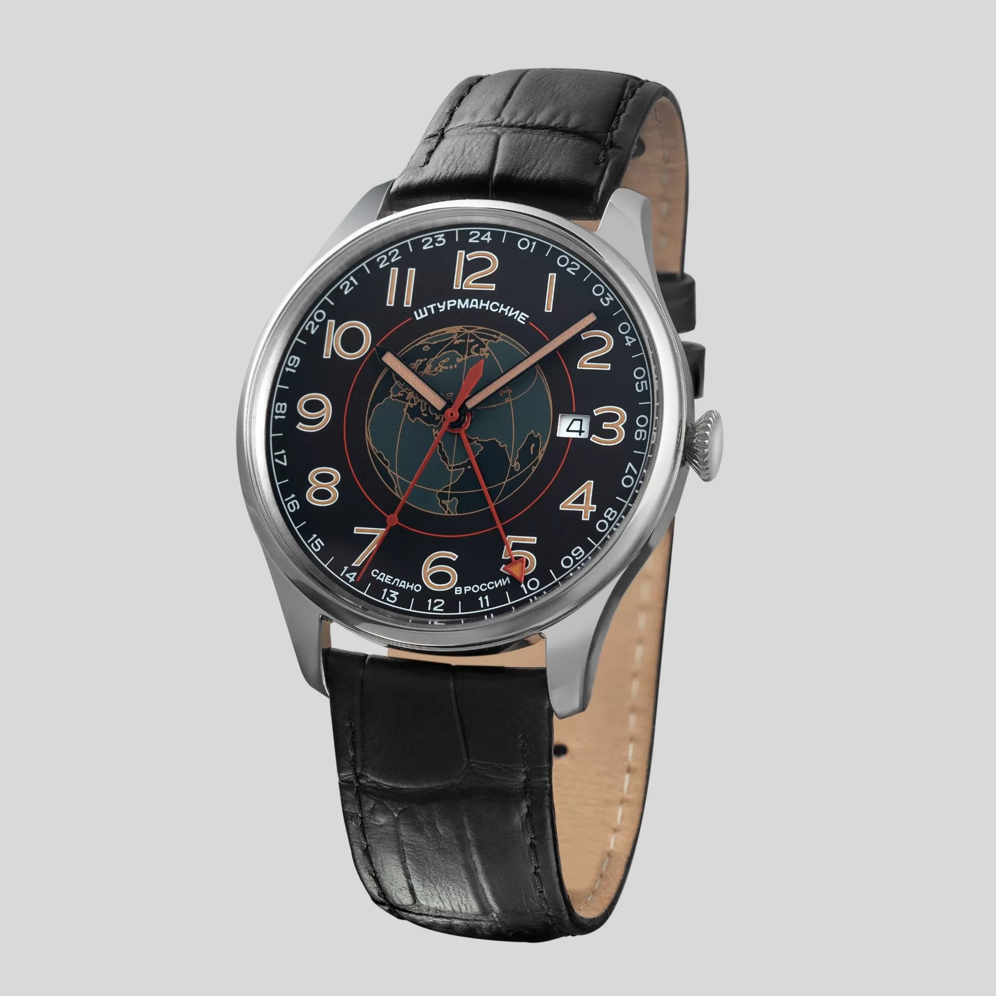 Changing cities, countries and time zones at a breathtaking speed that makes satellites in orbit jealous? In that case, a stylish watch from the Sputnik GMT collection with a quickly adjustable second time zone is a must have. The combination of a black leather strap and a watch face of the same colour with luminous and a stylised globe image makes this model incredibly stylish, masculine and austere, yet appealing. Its functionality is also up to the mark. In addition to the standard 12-hour dial for local time, it also has an adjustable scale for a second time zone, and a calendar disc for displaying the date. This shockproof and high-accuracy watch is equipped with a battery-operated Swiss quartz movement Ronda 51524. The steel case has an average degree of water resistance (5 ATM).Technical data