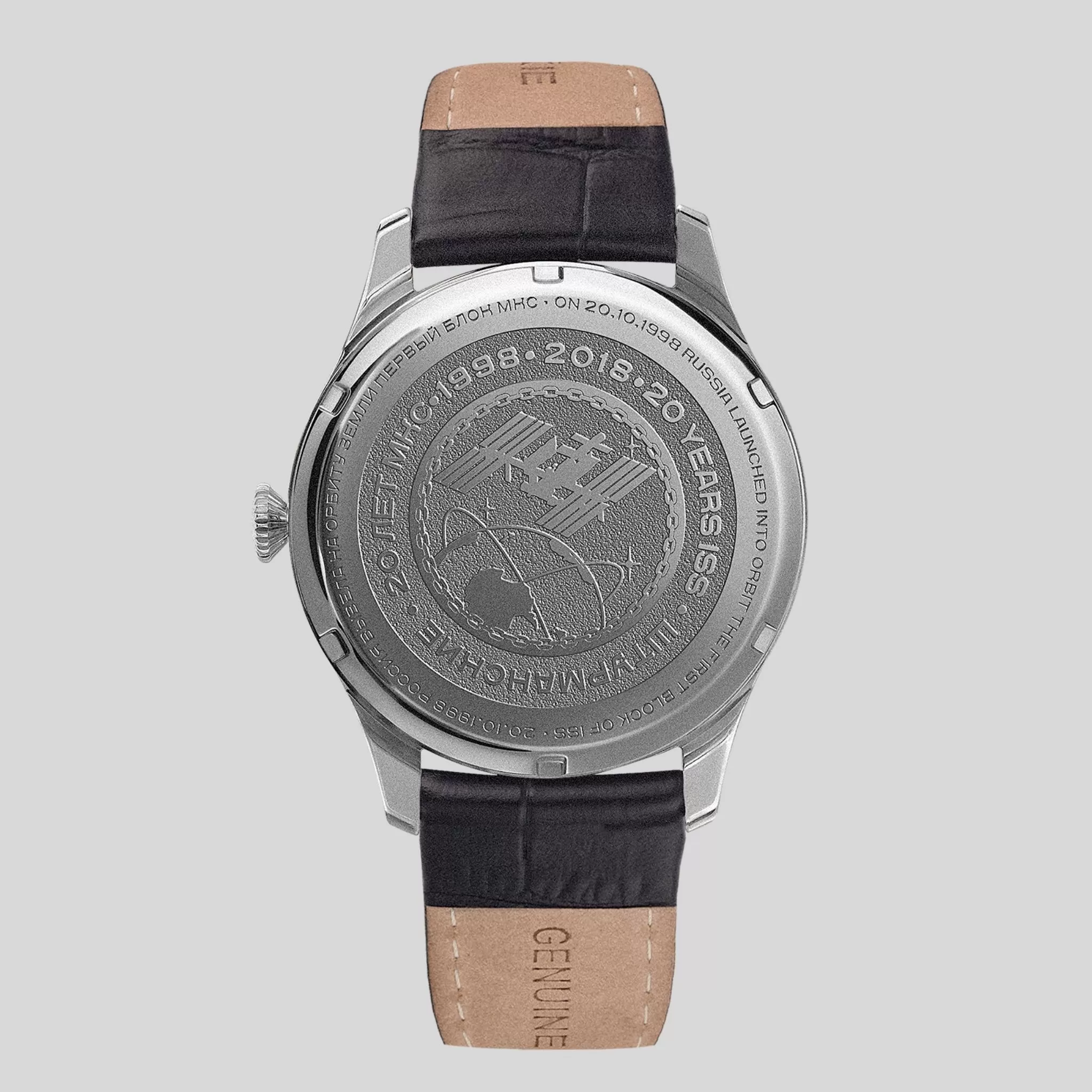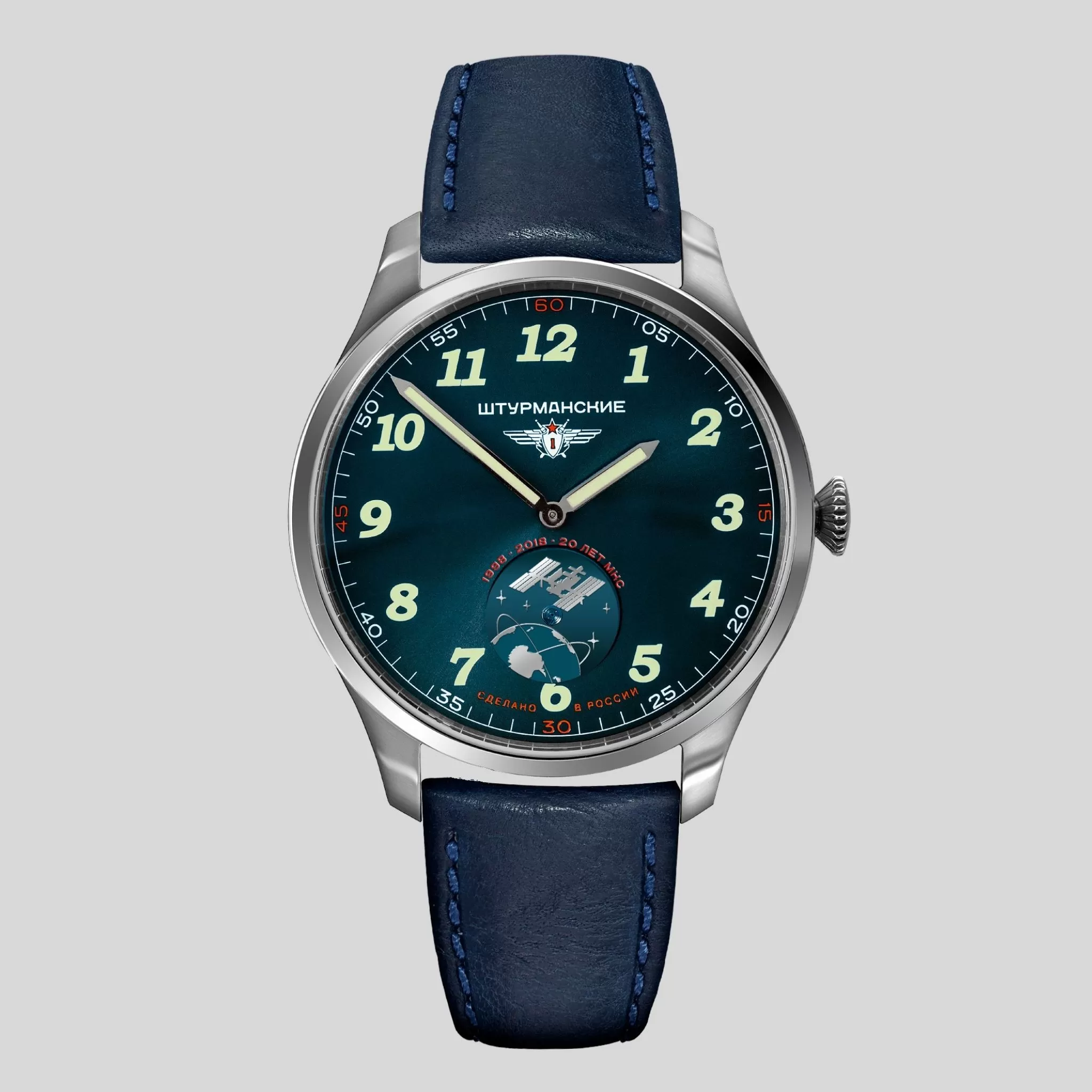 A unique model dedicated to the 20th anniversary of the International Space Station celebrated in 2018, this watch undoubtedly deserves to bear the ISS name since it is as reliable, functional and durable as the greatest miracle of world engineering. The space theme is supported by the deep dark blue colour of this watch, the ISS image on the seconds subdial, and the luminous numerals. The Japanese VD78 Seiko quartz movement is battery-operated and does not need to be wound. At the same time, it boasts enviable accuracy – it gains or loses no more than 10-20 seconds in a month. The watch face is covered with abrasion and scratch-resistant crystal, and the steel case is water resistant. The leather strap fits comfortably around your wrist.Technical data