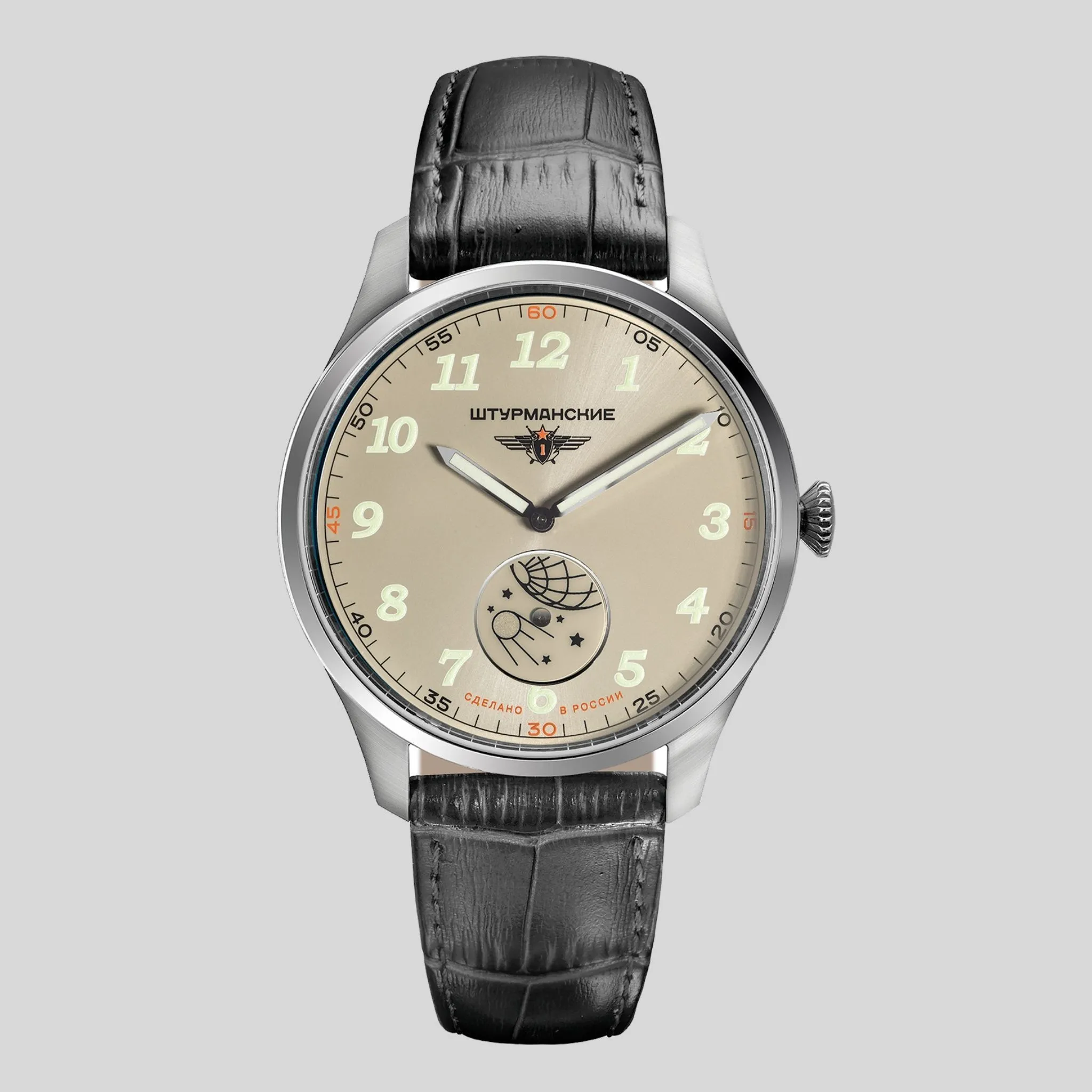 The launch of the first artificial satellite into the Earth’s orbit became a real breakthrough in space exploration. The Sturmanskie watch immortalised that revolutionary event in a special collection. Our Sputnik Heritage watches have taken the concepts of beauty, reliability and functionality to a new and previously unattainable level. This model relies on a classic design and stylish colour combination. The light grey dial creates a harmonious and expressive ensemble with the steel case and the black leather strap. The Japanese VD78 Seiko quartz movement is battery-operated. The watch needs to be adjusted very rarely because it gains or loses no more than 10-20 seconds per month. The case is water resistant. The luminous indexes are clearly visible in the dark. The model also has an original feature: the image of a satellite on the seconds subdial and back cover.Technical data